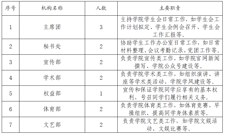 学院学生会主席团成员不超过3人,不设副主席。学院学生会机构设置参照校学生会,如需调整,应依程序向学院党委(党总支)、校学生会请示。