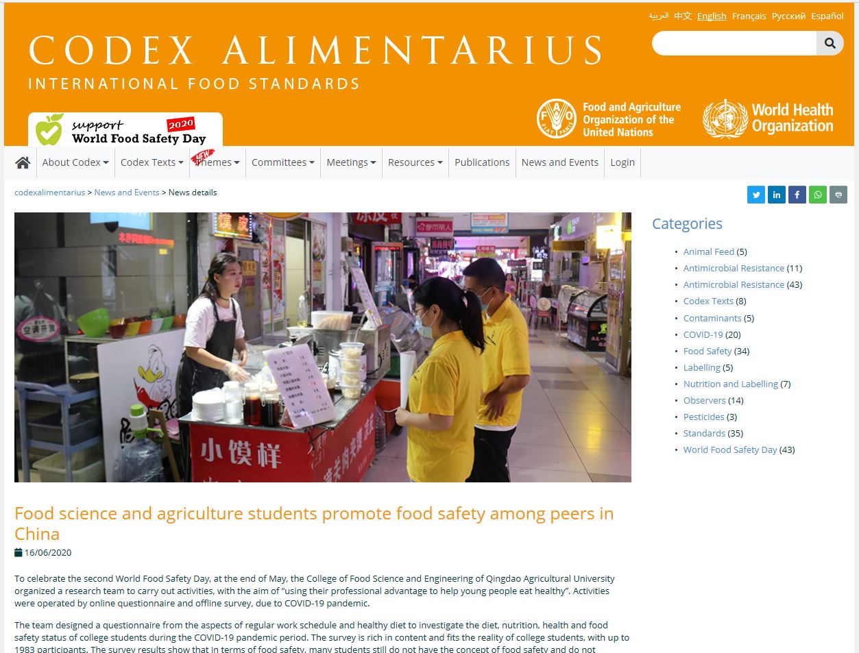 2020年6月,联合国粮农组织与世界卫生组织(FAO/WHO)在官方网站上发布了beat365在线体育官网在“世界食品安全日”举办的主题活动。