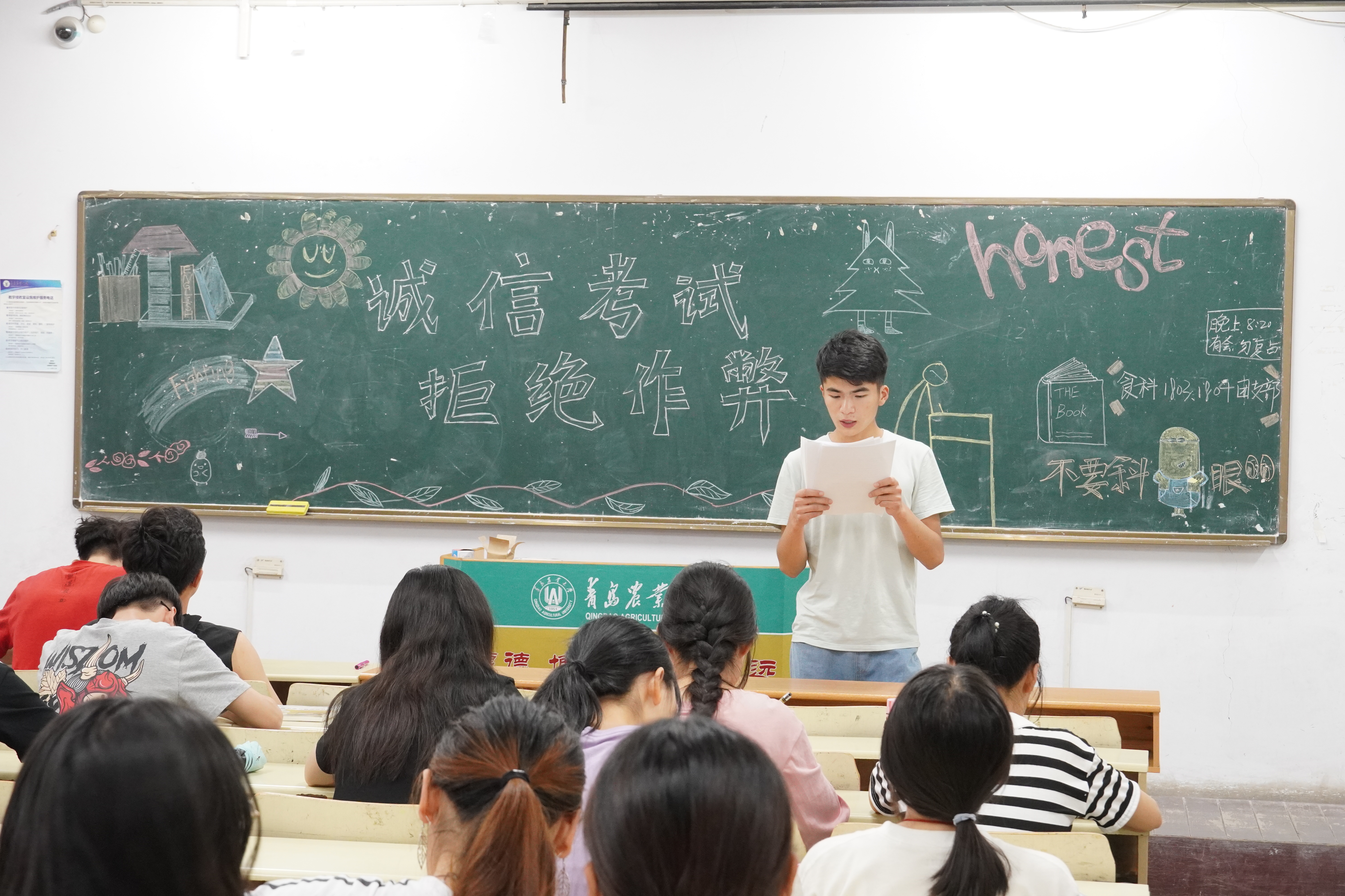 学习中,各班级主讲人带领同学们认真学习青岛农业大学考试违纪及作弊行为处理规定与考场管理规定的主要内容,并向同学们详细讲解了考场规则、考试违纪及作弊行为的认定和处理办法、处理程序等规定的相关事项。质检1802黄皓琛讲到,作为当代大学生,应严格遵守考场纪律、服从考试工作人员的安排,不偷看他人试卷、不代替或让他人答卷,不违背考试公正、公正原则,做到诚信考试,诚实做人。