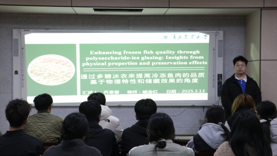 3月13日,食品学院2025年度第一期,总第三十八期“食学研讲”活动在食品楼302举行。本次活动由食品加工与安全专业24级研究生乔恩普同学主讲,主题为“通过多糖冰衣来提高冷冻鱼肉的品质:基于物理特性和储藏效果的角度”,吸引了学院师生广泛参与,共同探讨冷冻食品保鲜技术的前沿课题。
