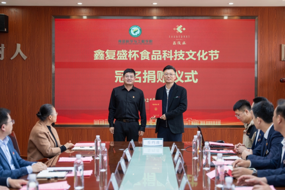 聚焦产学研深度合作和高质量发展,双方还签署了冠名捐赠协议,食品学院副院长肖军霞与鑫复盛集团副总经理、周钦公食品总经理高大明签署“鑫复盛杯”食品科技文化节冠名捐赠协议书。根据协议,自2025年起,鑫复盛集团连续3年捐资冠名青岛农业大学食品科技文化节,以此为平台,聚力推进食品学院人才培养等各项事业发展。食品学院副院长杨庆利向高大明副总经理颁发捐赠证书。