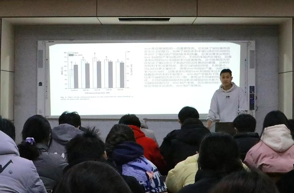 张子阳的报告不仅拓展了豆渣的应用前景,更展示了食品科技在提升食品品质、推动食品工业创新发展方面的巨大潜力。他的研究成果为食品工业的创新发展提供了新的视角和灵感,激发了师生们对于食品科学研究的浓厚兴趣和热情。